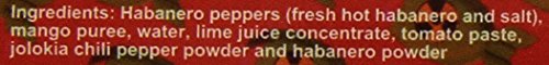 Ingrediënten: Habanero pepers (vers heet Habanero, zout), mangopuree, water, limoensapconcentraat, tomatenpuree, Jolokia chilipeperpoeder, Habanero poeder