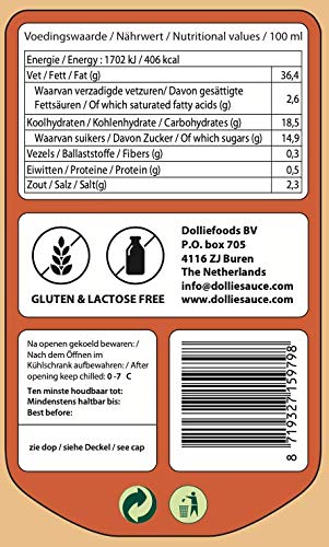 Dollie Sauce ORIGINAL 300ml Ingrediënten water, raapzaadolie, suiker, gemodificeerd maiszetmeel, zout, azijn, 1.9% knoflook, 1.4% chilipepers, EIGEEL, kruiden en specerijen, voedingszuur: (citroenzuur, melkzuur, azijnzuur), conserveermiddel: kaliumsorbaat, MOSTERDZAAD, verdikkingsmiddelen: xantaangom, guargom, antioxidant: (ascorbinezuur, E385)