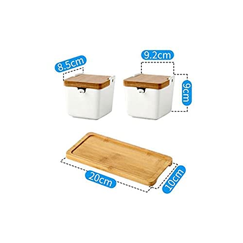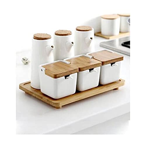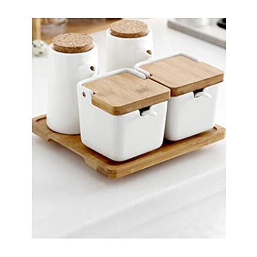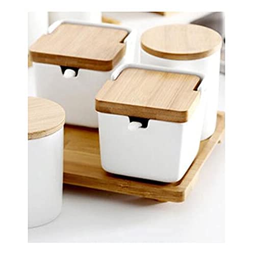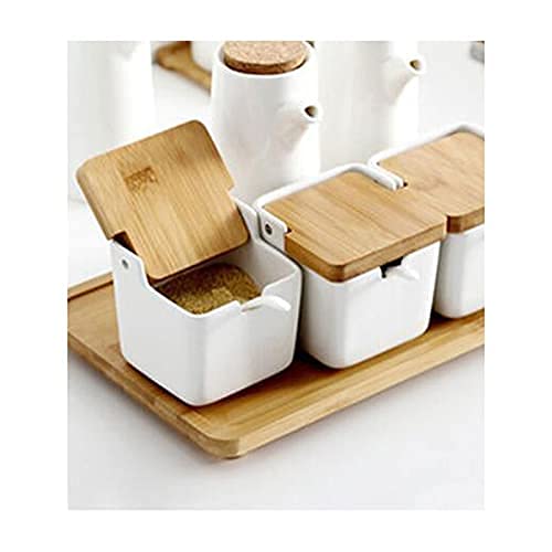 Spice-box keramische kruiderij pot kruidencontainer,met bamboe deksel,porseleinen lepel,houten dienblad,Kleur:wit,kan…