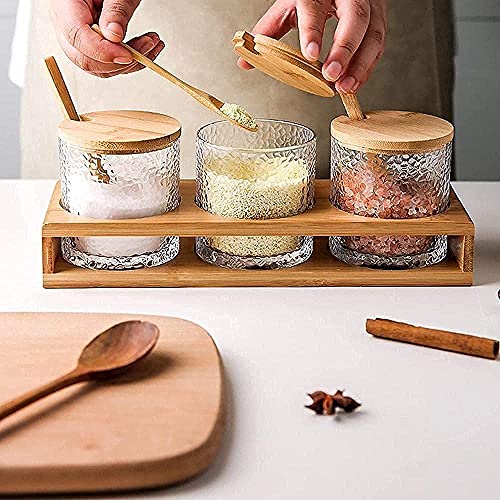 SET VAN 3 CREATING CANISTERS:Kruiden Organizer Jars Set gemaakt van hoog borosilicaatglas en natuurlijk bamboe.Dat is duidelijk en moeilijker dan normaal glas.Je kunt zout,peper,chili,sauzen,suiker en ander kruiderij opslaan.